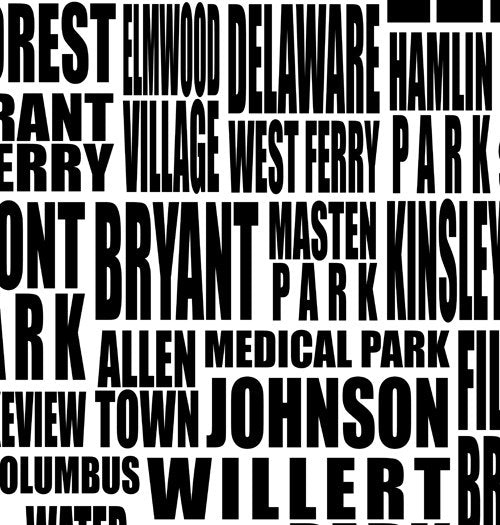 Mapa tipográfico de los barrios de Buffalo, Nueva York. El color de ejemplo que se muestra es el cielo nocturno antártico.