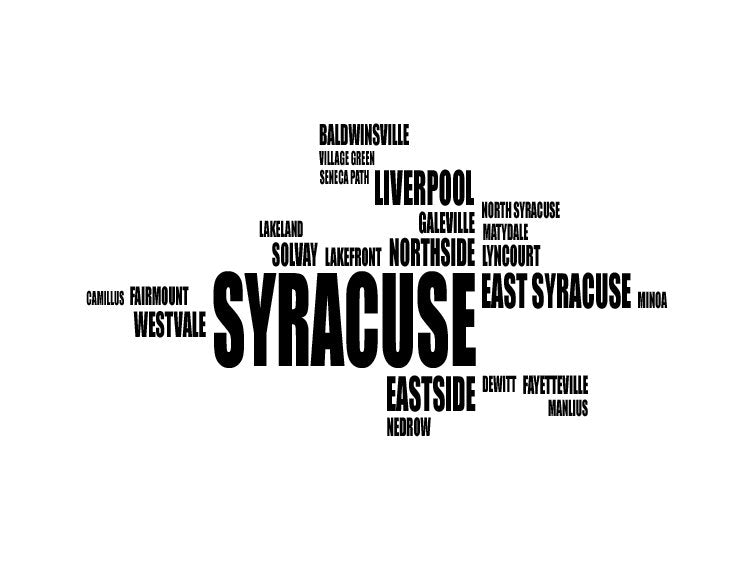 Mapa tipográfico de Siracusa, Nueva York, Estados Unidos. El color de ejemplo que se muestra es el cielo nocturno antártico.