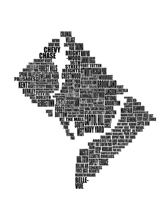 Mapa tipográfico de los barrios de Washington DC. El color de ejemplo que se muestra es el cielo nocturno antártico.