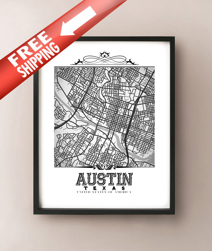 Mapa vintage en blanco y negro de Austin, Texas, Estados Unidos.
