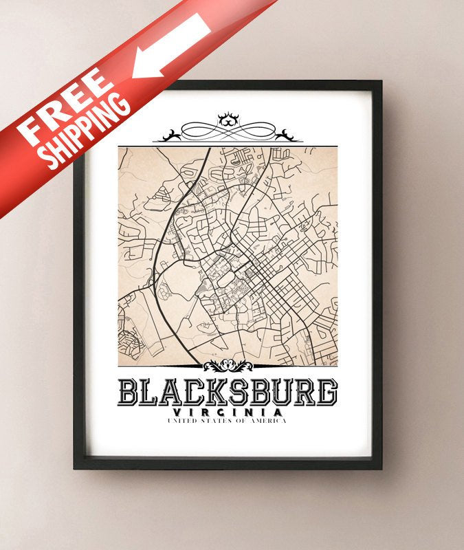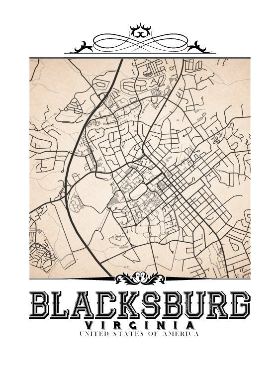 Mapa vintage sepia de Blacksburg, Virginia, Estados Unidos.