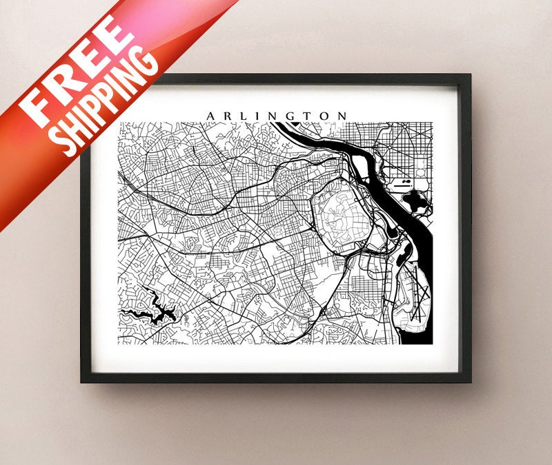 Black and white map of Arlington, Virginia, USA.