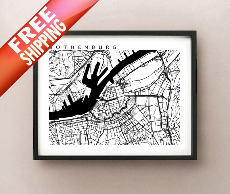Black and white map of Gothenburg, Sweden.