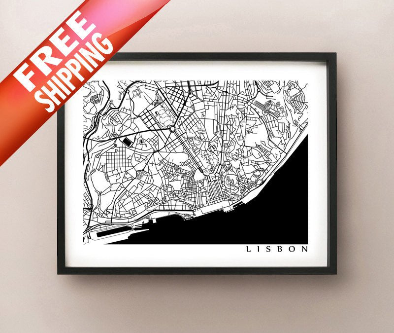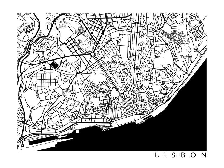 Black and white map of Lisbon, Portugal.