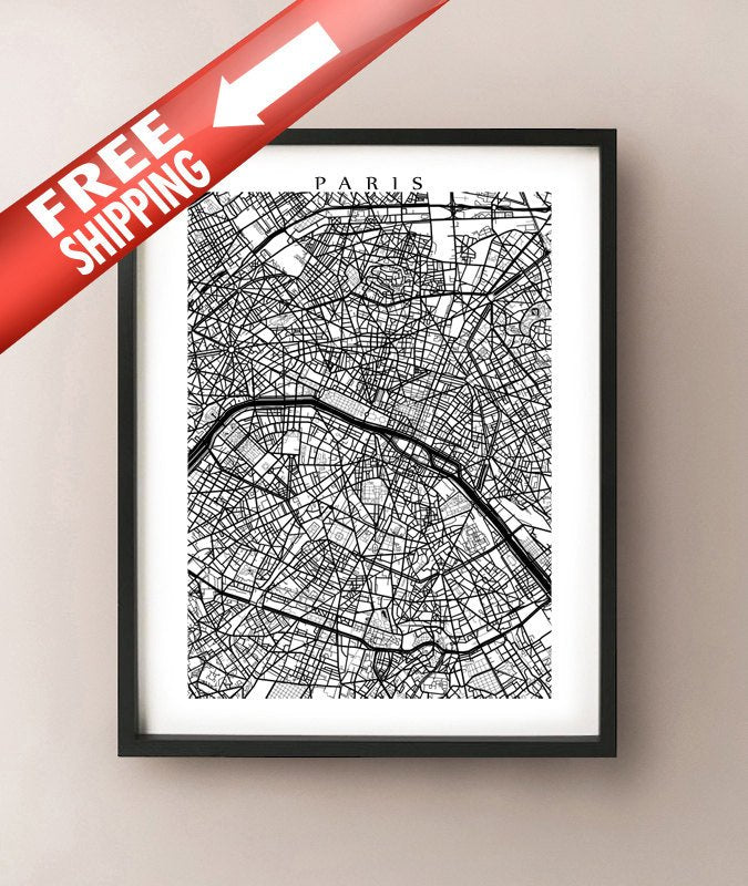 Black and white map of Paris, France.