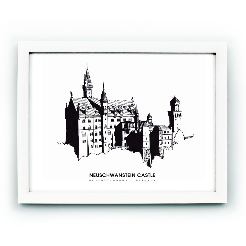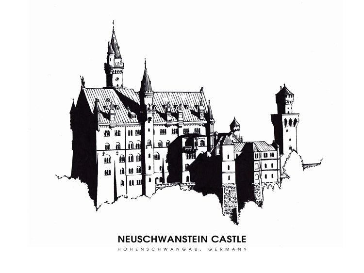 Drawing of Neuschwanstein Castle in Hohenschwangau, Germany.