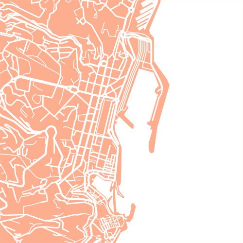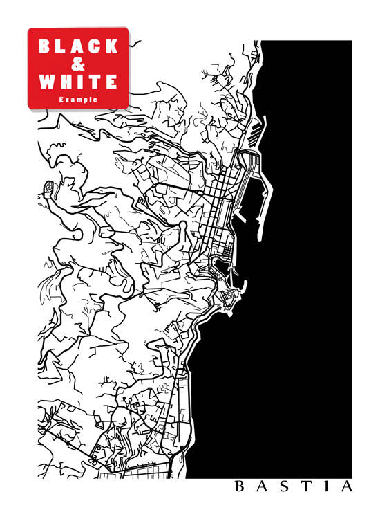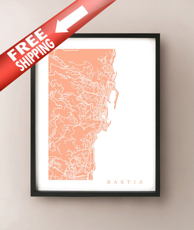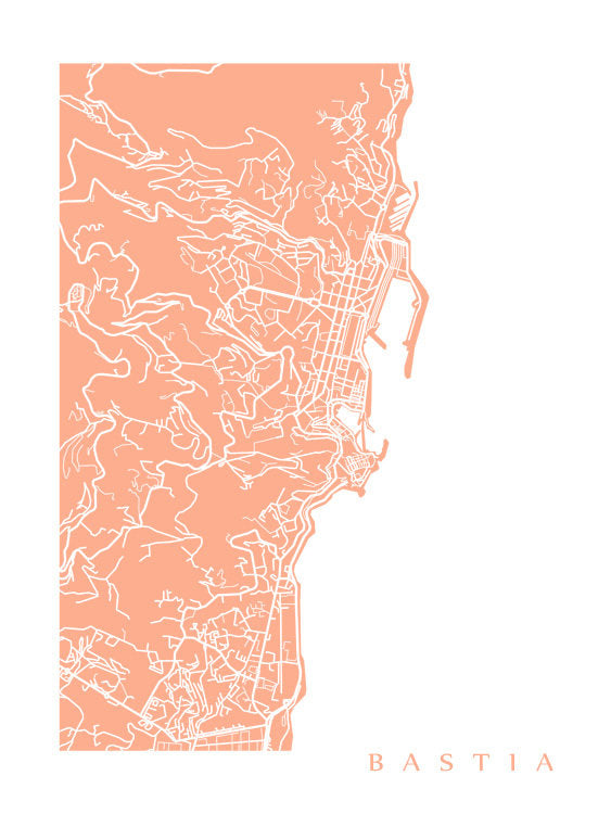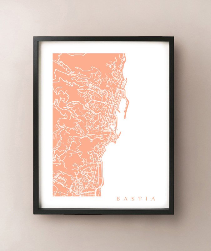 Map of Bastia, France. Example colour shown is Serengeti Sunrise.