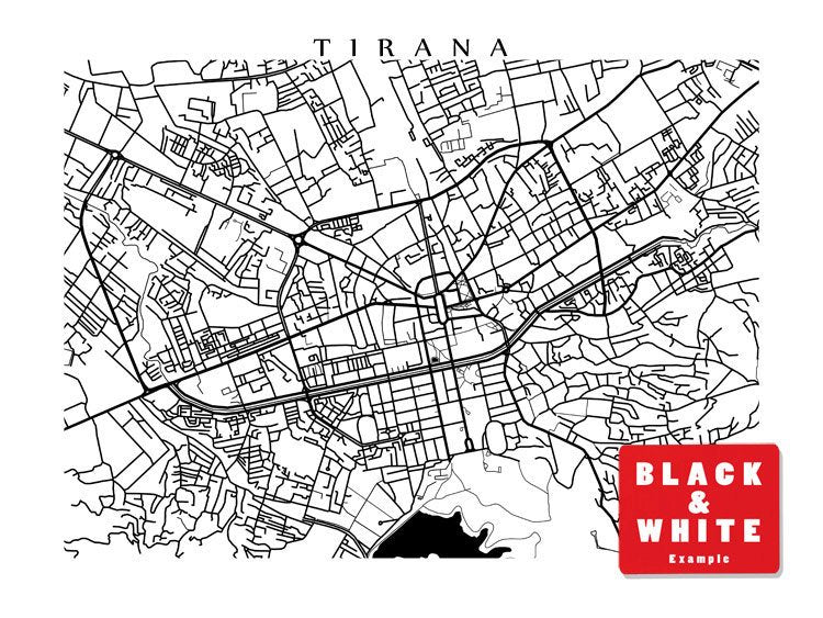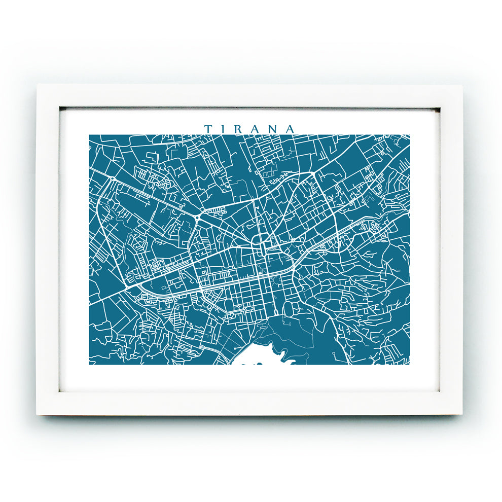 Map of Tirana, Albania. Example colour shown is Indian Peacock.