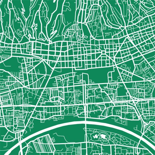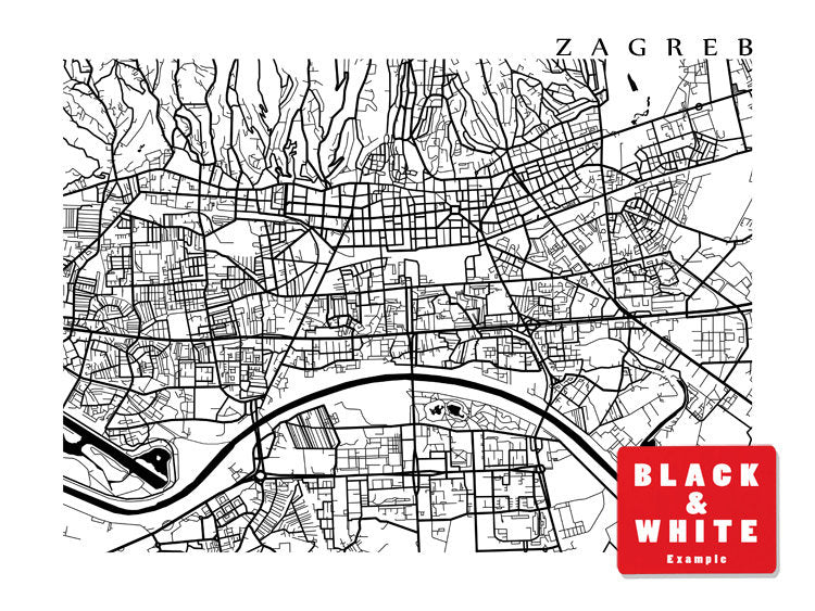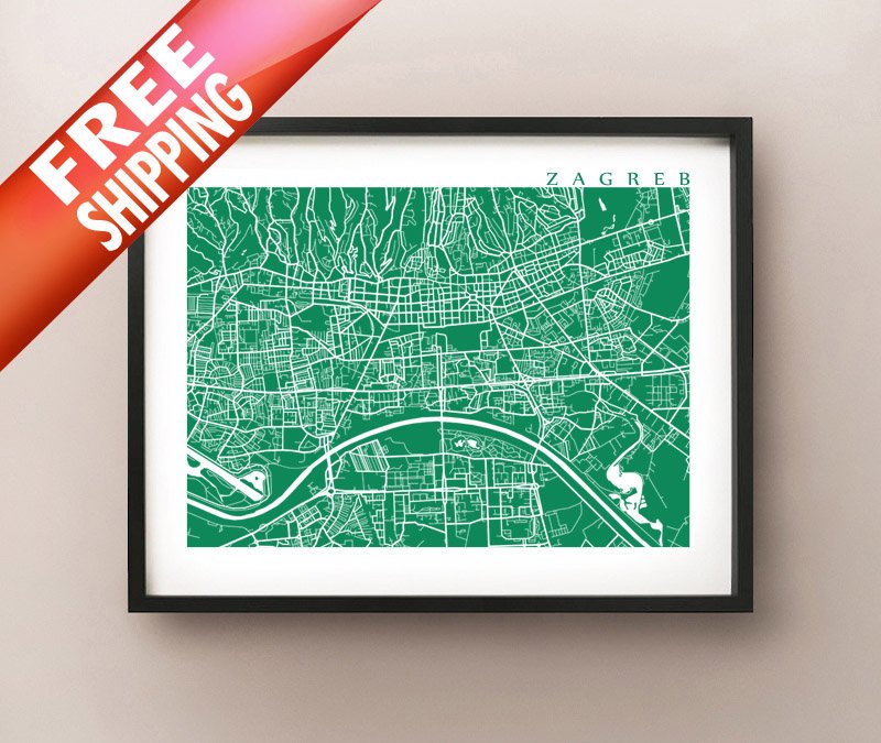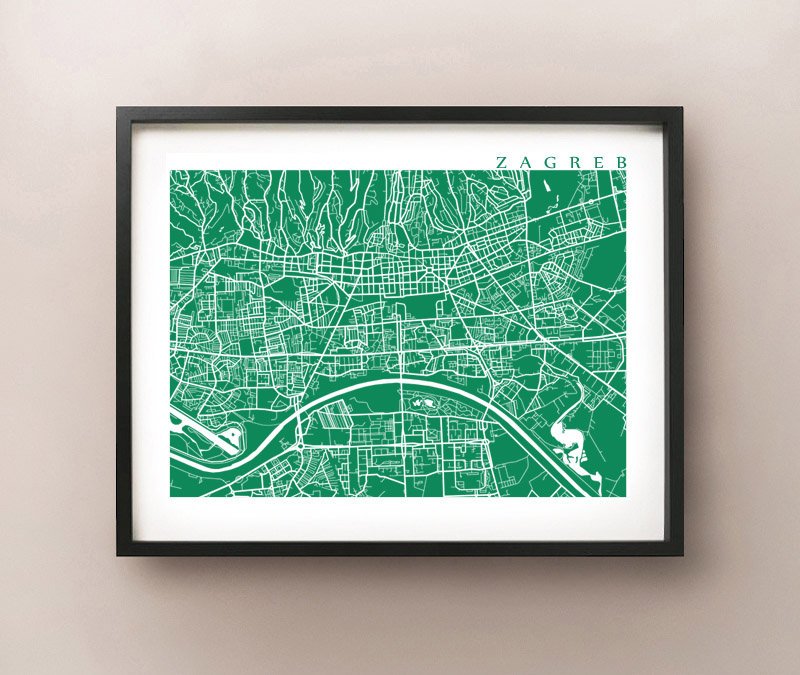 Map of Zagreb, Croatia. Example colour shown is Amazon Rainforest.