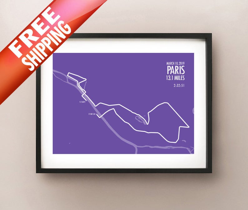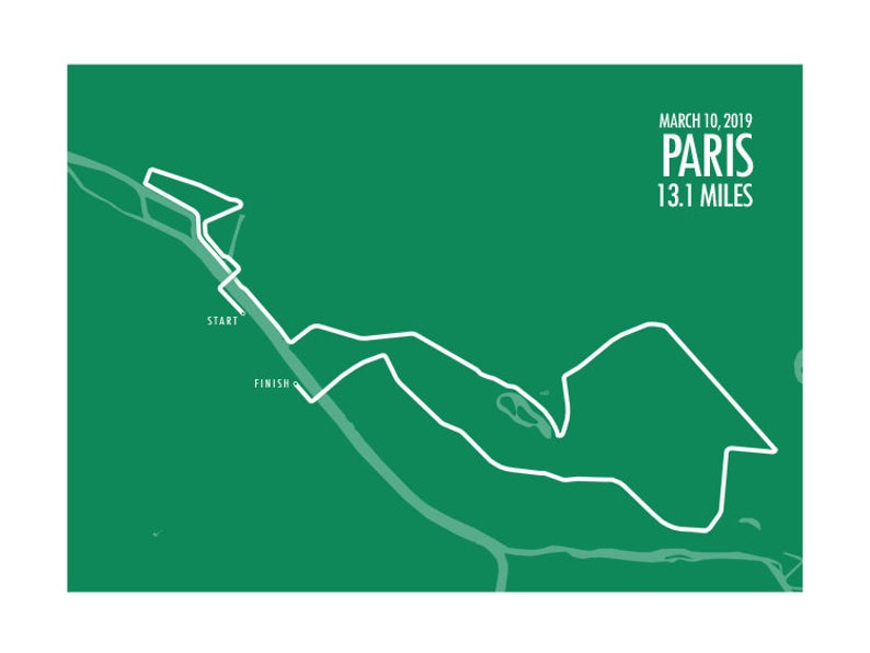 2019 Paris Half-Marathon map. Example colours shown are Greek Iris, Default Blue, and Amazon Rainforest.
