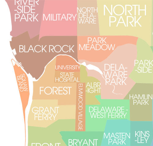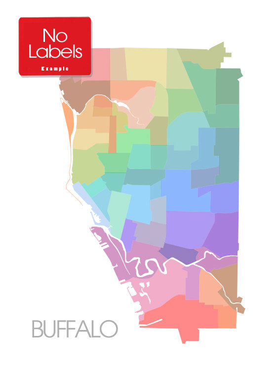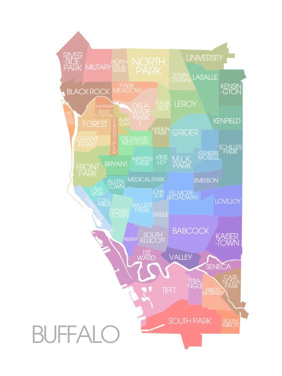 Multi-colored neighborhood map of the city of Buffalo, New York, USA.