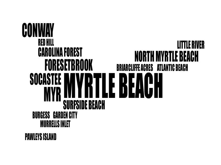 Typography map of Myrtle Beach, South Carolina, USA. Example color shown is Antarctic Night Sky.