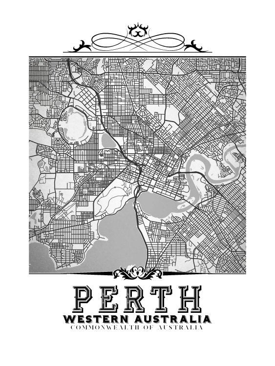 Black and white vintage map of Perth, Australia.